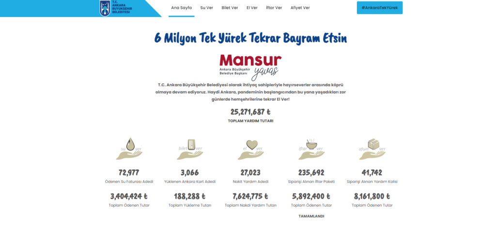 “6 Milyon Tek Yürek” kampanyası devam ederken, hayırseverler ‘ankaratekyurek.com’ adresi üzerinden ‘Su Ver’, ‘Bilet Ver’, ‘El Ver’ ve ‘Afiyet Ver’ uygulamalarından istediğini seçerek, ihtiyaç sahiplerinin yüzünü güldürmeye devam edebilecek.