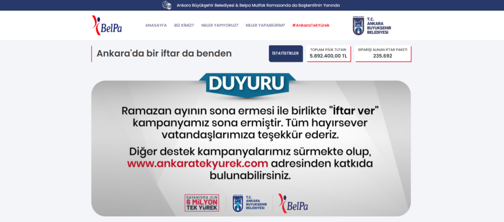 Sadece Ankara değil Türkiye’nin tek yürek olduğu kampanya ülke sınırlarını aştı ve toplam bağış tutarı 41 günde 25 milyon TL’yi geçti. Geçen yıl Ramazan ayı ile Kurban Bayramı arasında düzenlenen kampanyaya gelen yaklaşık 40 milyon TL’lik destek tutarı ile dayanışma hareketinin iki yılda toplam tutarı 65 milyon TL’yi aştı.