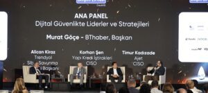 Açılış konuşmasının ardından BThaber Başkanı Murat Göçe’nin yönettiği ana panel “Dijital Güvenlikte Liderler ve Stratejileri”de, Ajet CISO’su Timur Kadızade, Yapı Kredi İştirakleri CISO’su Korhan Şen, Trendyol Siber Savunma Merkezi Başkanı Alican Kiraz online satış, finans ve bankacılık, havacılık sektörlerindeki siber güvenlik deneyimlerini ve yapay zeka ile değişen, değişecek uygulamalarını paylaştı. Timur Kadızade, yeni kurulan bir şirket olmalarına rağmen Türk Hava Yolları’nın bilişim ağı sayesinde güçlü bir siber alt yapıya sahip olduklarını belirterek, dünyadaki gelişmelere göre her geçen gün güvenlik sistemlerini geliştirdiklerini vurguladı. Korhan Şen ise, bankacılık sisteminde güçlü bir alt yapıya dikkat çekerek sürekli gelişmenin ve risklerini güncellemenin önemine dikkat çekti. Şen bu amaçla insana, teknik alt yapıya, teknolojiye sürekli yatırım yaptıklarını belirtti. Alican Kiraz ise, yapay zeka ile oluşturulan algının daha çok akademik dünyayı anımsattığını belirterek, bu algının değişmesini gerektiğini söyledi. Akademik yapay zeka ile iş dünyası bir aradalığının teşvik edilmesinin önemli olduğunu belirten Kiraz, dünyanın bu yönde ilerlediğini ifade etti.