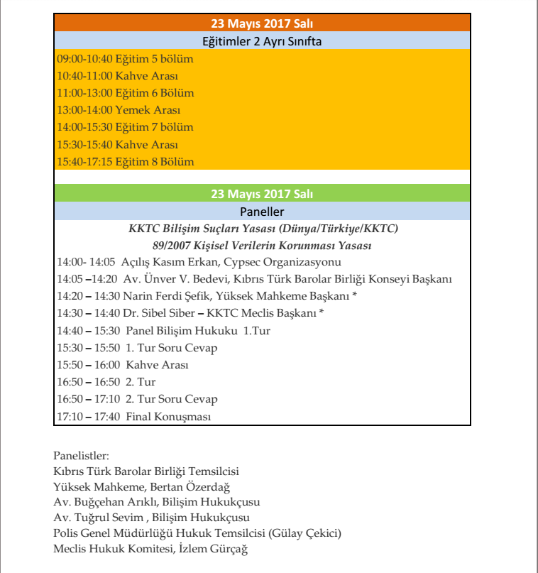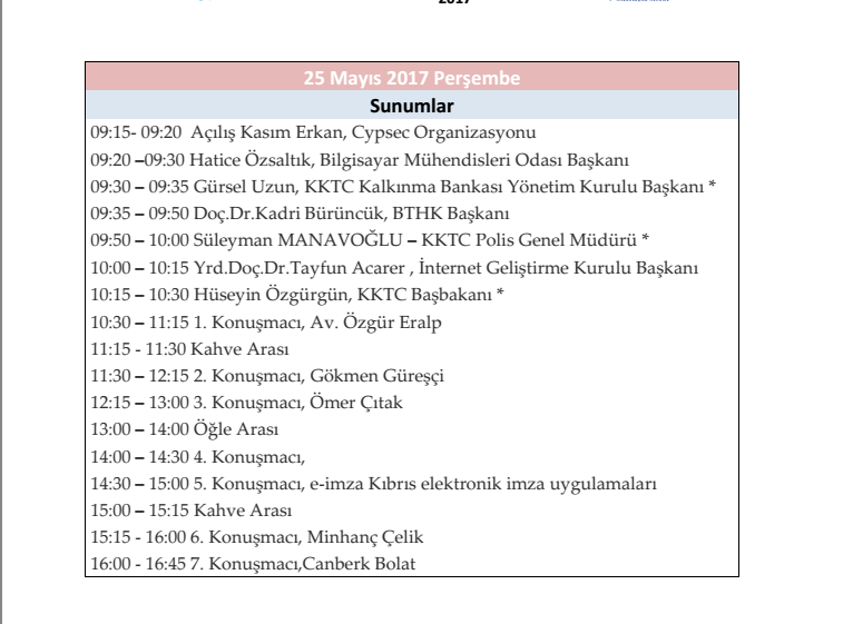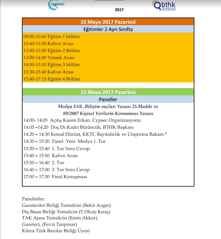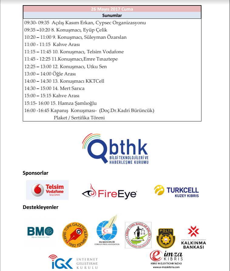 Cysec 2017 Siber Güvenlik Konferansı 22-26 Mayıs 2017 tarihlerinde gerçekleşecek. Bilgi Teknolojileri ve Haberleşme Kurumu katkılarıyla gerçekleşen etkinliğe ait program da paylaşıldı.