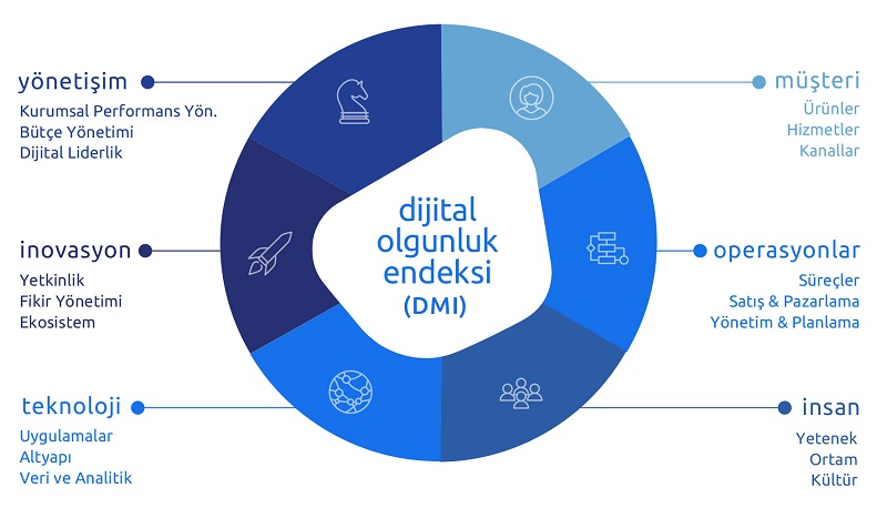 Bizim DMI dediğimiz dijital olgunluk endeksi 6 boyuta bakıyor. Ki bu boyutlar her ölçekte, her sektörde, her ülkedeki şirketlerde ve kurumlarda vardır. Birinci boyut olarak müşteri ve ona dokunan her şeyin ne kadar dijital olduğunu ölçüyoruz. İkinci olarak operasyonların, yani süreçlerinin tümünün ne kadar dijital olduğunu değerlendiriyoruz. Üçüncü boyut işin insan boyutu, yetkinlikler, çalışma ortamı, kurum kültürü ve bunların dijitali ne kadar desteklediğini irdeliyoruz. Dördüncü boyut inovasyon, zira dijital dönüşüm kapsamında oldukça önemli bir yer teşkil ediyor. Beşinci boyut yönetişim, bu kapsamda finansal yönetim, performans yönetimi, liderlik, strateji ve benzeri unsurları değerlendiriyoruz. Son ve altıncı boyut olarak da teknolojik altyapıyı, uygulamaları, veri yönetimi ve analitik yetkinlikleri ölçüyoruz, bunların dijital dönüşümü ne kadar desteklediğini ne kadar mümkün kıldığını anlamaya çalışıyoruz.