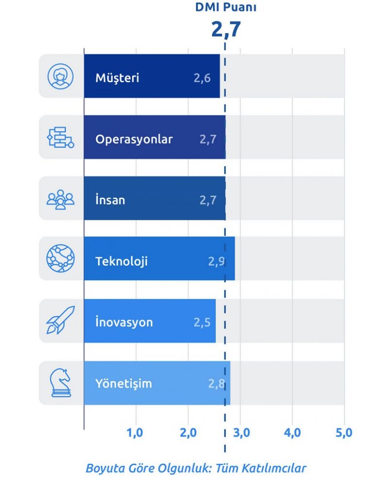 Tüm ölçtüğümüz şirketlerin dijital olgunluk ortalaması beşlik skala üzerinden 2,7 çıktı. 3 seviyesi tam entegre bir seviyedir. Demek ki daha tam entegrasyon sağlanmadı, veri kalitesi biraz düşük, kurumların çeviklikleri biraz daha gelişmeli. Şirketlerin teknoloji ve yönetişim boyutları hafifçe bu ortalamanın üstünde, ancak müşteri ve inovasyon boyutları hafifçe bu ortalamanın altında kalmış durumda.