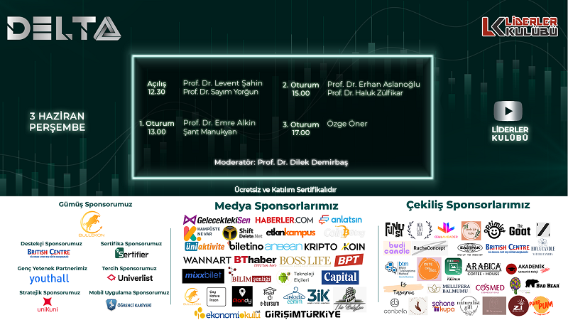 İstanbul Üniversitesi İktisat Fakültesi bünyesindeki Liderler Kulübü’nün bu yıl ilkini gerçekleştireceği Delta’21’de ekonominin en merak edilenleri, sanal para teknolojileri, dijitalleşme, finansal piyasalar ve çok daha fazlası detaylıca ele alınacak. Katılımcılar birbirinden değerli bilgiler edinerek kendini geliştirme ve öne çıkma fırsatı yakalayacak. Ayrıca, Delta’21’in katılımcılarına muhteşem hediyeleri olacak ve etkinlik katılımcılarına sertifika verilecek.