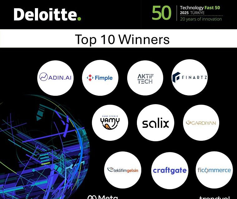 Deloitte Teknoloji Fast 50 Programı, her yıl dünya genelinde en hızlı büyüyen teknoloji şirketlerini belirliyor. Türkiye’de 20’nci kez düzenlenen program kapsamında bu yılın Fast 50 listesi ve özel ödüllerin kazananları, The Peninsula İstanbul’da gerçekleştirilen törenle açıklandı. Deloitte Türkiye’nin bu yıl Meta ve Trendyol iş birliğiyle düzenlediği Teknoloji Fast 50 programında son üç yılda yüzde 8990’lık büyüme kaydeden yapay zekâ çözümleri şirketi ADIN.AI, ilk sırayı alarak Türkiye’nin en hızlı büyüyen teknoloji şirketi oldu. Fintek sektöründe faaliyet gösteren Fimple, yüzde 3142 büyümeyle ikinci; yazılım alanında çözümler üreten Aktif Tech ise yüzde 2919’luk büyümeyle üçüncü sırada yer aldı. En hızlı büyüyen ilk 10 şirket listesindeki diğer şirketler ise şöyle sıralanıyor: Finartz, Yamy, Salix, Gardiyan, TeklifimGelsin, Craftgate, fiCommerce. Liste, şirketlerin son üç yıllık net satış gelirlerindeki büyüme oranları değerlendirilerek hazırlanıyor.