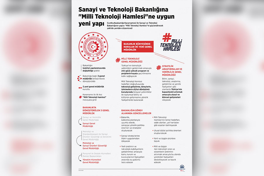 Cumhurbaşkanlığı Teşkilatı Hakkında Cumhurbaşkanlığı Kararnamesinde Değişiklik Yapılmasına ilişkin Cumhurbaşkanlığı Kararnamesi Resmi Gazetede yayımlanarak yürürlüğe girdi. Kararname ile Sanayi ve Teknoloji Bakanlığının teşkilat yapılanmasında da değişikliğe gidildi. Kararname ile Bakanlığın görev alanında güncellemeler yapılırken, bazı değişiklikler de ilk kez mevzuata girmiş oldu. Değişikliğe göre Bakanlık; kalkınma planları ile uyumlu olarak, sanayiye yönelik politika önerileri ve stratejiler oluşturacak, sanayi stratejilerine ilişkin uygulamaları izleyecek, sanayileşme politikaları çerçevesinde yerli üretimin ve teknolojik kabiliyetlerin geliştirilmesi amacıyla kamu kurum ve kuruluşlarının faaliyetleri arasında eşgüdümü tesis edecek. Yüksek katma değerli ve kritik teknolojik ürünlerin milli ve özgün imkânlarla geliştirilmesi ve yüksek teknoloji ürünlerinin yerli olarak üretilmesi ile ulusal düzeyde teknolojik atılımı hedefleyen ‘Milli Teknoloji Hamlesi’nin temel hedefleri, odak alanları, yol haritaları gibi esasları belirleyecek. Bu esasların uygulanmasını sağlayacak tedbirleri alacak. Yürürlüğe giren Cumhurbaşkanı Kararnamesi ile Bakanlığın görev alanlarına bir yenisi daha eklendi. Buna göre Bakanlık; bireylerin ve işletmelerin dijital dönüşümüne ve ulusal düzeyde dijital ekonominin geliştirilmesine yönelik politika önerileri ve stratejiler oluşturacak. Stratejilerin uygulanması konusunda kamu, özel sektör, üniversiteler, sivil toplum kuruluşları gibi paydaşlar arasında iş birliği ve eşgüdümün tesis edilmesine yönelik tedbirler alacak, dijital ekonomi ve dijital dönüşüm ekosisteminin geliştirilmesi amacıyla program ve projeler yürütecek.
