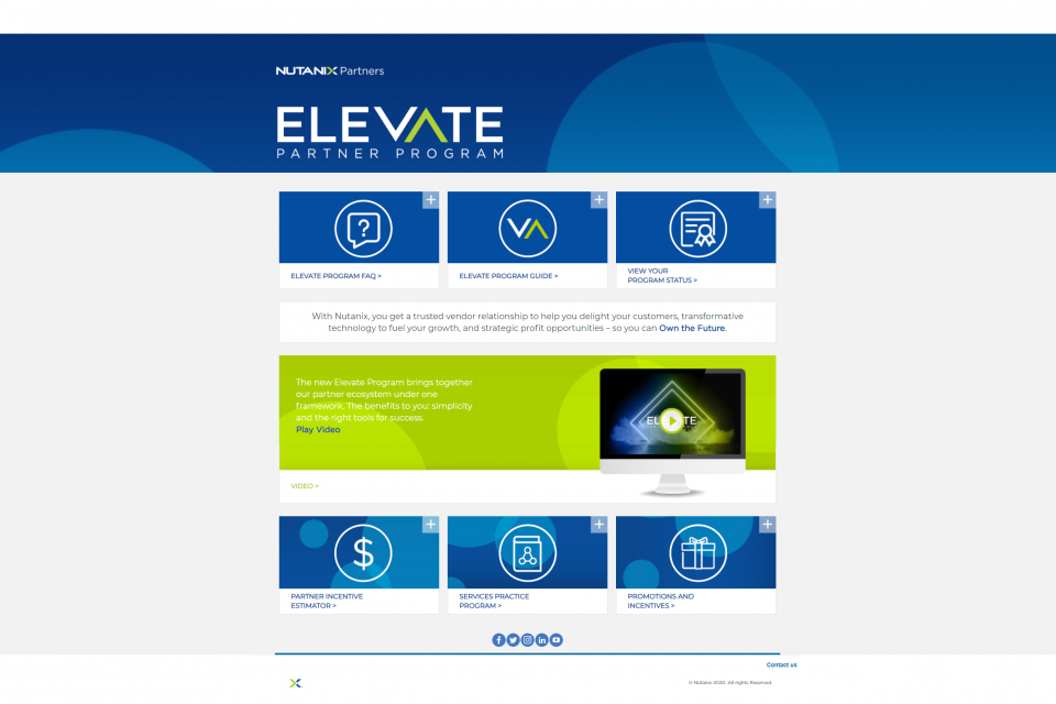 - Kazanç: Elevate, ön uç marjlar, marj açısından zengin hizmetler sunmaya yardımcı olacak yeni mekanizmalar, yeni işler getirmek için zengin iade seviyeleri ve Elevate Cloud Champion iş ortaklarını tüm Nutanix genelinde satış için ödüllendiren yeni indirim oranları dahil olmak üzere yeni kazanç fırsatları yaratıyor.